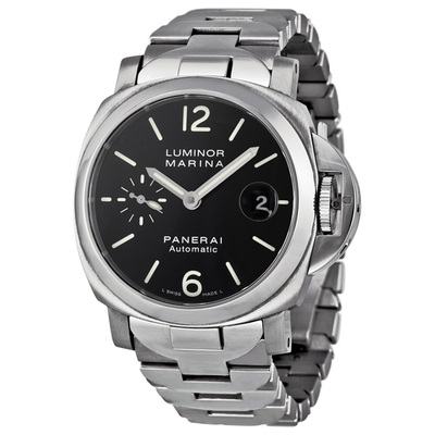 Silver-tone stainless steel case with brushed and polished bracelet. Fixed silver-tone stainless steel bezel. Black dial featuring luminous hands, index hour markers (with Arabic numerals at 6 and 12). Analog dial type with luminescent hands and markers. Date display located at the 3 o'clock position. Seconds sub-dial positioned at the 9 o'clock position along with additional subdials. Panerai Calibre OP III Automatic movement, derived from 7750-P1, equipped with 21 jewels, operating frequency of 28800 vph (42,666 p.m.). Power reserve is approximately 42 hours. Scratch resistant sapphire crystal. Lever crown stainless steel case protection. Solid case back. Cushion shaped case measuring 40 mm in diameter. Silver-tone bracelet with a width of 20 mm. Fold over clasp closure mechanism. Water resistance rated at 300 meters / 1000 feet (equivalent to 30 bar). Functions include displaying the date, hours, minutes, small seconds hand for elapsed time, and chronometer capability. Men's luxury watch manufactured in Switzerland.