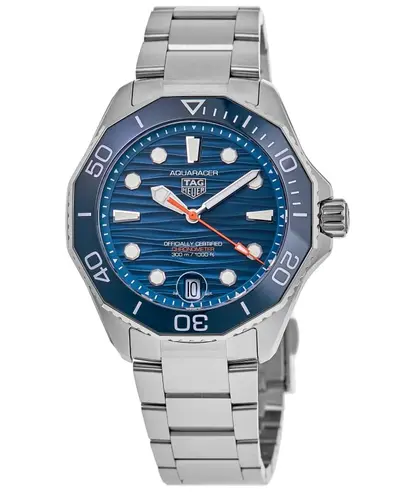 Brand new authentic Tag Heuer Aquaracer. Professional 300 model with automatic movement and date function. Features a blue dial equipped with luminous silver tone hands and markers, including circle/stick hour marks and minute gradations around the outer rim plus a date display at six o'clock. Case is brushed and polished stainless steel finished in a unique shape measuring 42mm diameter by 12mm thick. Includes solid case back and deployment buckle with push-button clasp also made from brushed/polished stainless steel. Sports band constructed of brushed/polished stainless steel material completes the look. Watch includes sapphire crystal for scratch resistance, screw down crown, chronometer certified movement (TH31-00 COSC), sub-dials displaying date functions alongside hour and minute indications. Rated at 300 meters or 990 feet water resistant depth.