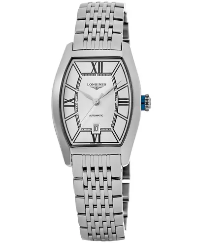 Authentic Longines women's automatic watch with stainless steel case and bracelet, featuring a silver tone dial with Roman numeral hour markers and date display at the 6 o'clock position. The tonneau-shaped case measures 30.6mm x 26mm with an 8.7mm thickness and comes equipped with scratch-resistant sapphire crystal. Powered by Longines Caliber L592 automatic movement ensuring reliable performance, it includes hour, minute, second, date functions and has a power reserve of approximately 45 hours. The watch is water resistant up to 30 meters (100 feet) and features a deployment push button clasp with solid case back.