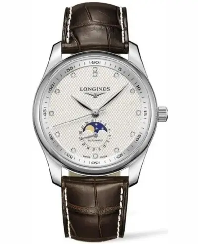 A men's automatic watch from the Longines Master Collection featuring a silver dial, diamond hour markers, and brown leather strap. The case is crafted in stainless steel, displaying key functions including an analog date display at the 6 o'clock position, moon phase indicator, power reserve indicator, hours, minutes, seconds hands, sapphire crystal with scratch resistance, round shape, 40mm diameter, transparent back, and water resistance up to 30 meters (100 feet). It features a mechanical automatic movement.