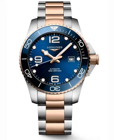 Authentic Longines men's automatic watch with black dial, ceramic and stainless steel case, two-tone rubber strap, folding clasp, unidirectional rotating bezel, rose gold tone luminous markers and hands, date display at 3 o'clock, sapphire crystal glass, powered by Caliber L888 movement with 72-hour power reserve, round 43mm size.
