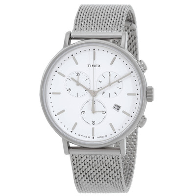 Silver-tone stainless steel case with a silver-tone stainless steel mesh bracelet. White dial with silver-tone hands and index hour markers. Dial Type: Analog. Date display at the 4 o'clock position. Chronograph - three sub-dials displaying: 60 second, 30 minute and 1/10th of a second. Quartz movement. Scratch resistant mineral crystal. Solid case back. Round case shape, case size: 41 mm, case thickness: 11 mm. Jewelry clasp. Water resistant at 30 meters / 100 feet. Functions: chronograph, date, hour, minute, second. Fairfield Series. Timex Fairfield Chronograph Quartz White Dial Mens Watch TW2R27100.