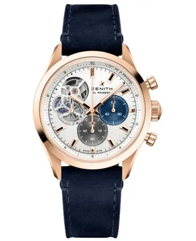 Authentic Zenith Chronomaster Open men's watch, model number: 18.3300.3604/69.C922. Features an automatic chronograph movement powered by the El Primero Caliber 3604 with a 60-hour power reserve. Comes equipped with basic functions including hour, minute and second display as well as full chronograph capabilities featuring three sub-dials for seconds (large), minutes, and small seconds respectively. The case is made of brushed and polished 18K rose gold in a round shape measuring 39.5mm. It has a screw-down crown and is protected by scratch-resistant sapphire crystal. Secured with an elegant blue calfskin leather strap fitted to the rose gold deployment buckle fold-over clasp. The matte silver dial includes luminous rose gold tone hands and stick hour markers, complemented by minute and 1/10th second markers around its outer rim. Offers 100 meters (approx. 330 feet) water resistance and comes with a 2-year WatchMaxx warranty.