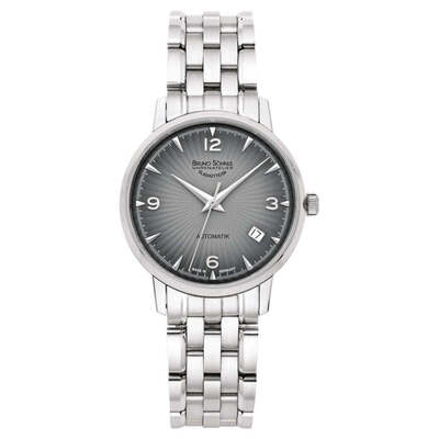 Series: Stuttgart, a tribute to the founder's Swabian roots. Case: Silver-tone stainless steel. Bezel: Fixed silver-tone stainless steel. Dial: Grey analog display with silver-tone hands and Arabic numeral & index hour markers; features minute indices and outer ring minute markers. Date function positioned at 4 o'clock. Movement: Sellita Caliber SW200-1 Automatic, 26 Jewels, beats per hour (bph) 28800, approx. 38-hour power reserve. Crystal: Scratch-resistant sapphire glass. Crown: Pull / push type. Case Shape: Round, size 36 mm, thickness 10.5 mm. Strap Width: 18 mm, material not specified (inferred leather or alternative common for model). Clasp: Fold over style. Water Resistance: Up to 50 meters / 165 feet. Functions: Analog timekeeping displaying hours, minutes, seconds; date display. Style: Casual watch.