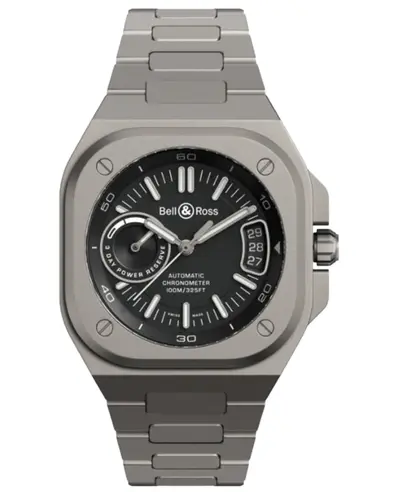 Bell & Ross BR-X5 Automatic Black Dial Grey Titanium Men's Watch. Features a Swiss automatic chronometer movement with 70-hour power reserve, black dial displaying luminous stick hour and minute markers (outer rim), date at 3 o'clock via sub-dial, sapphire crystal scratch-resistant glass, screw-down crown, fixed bezel, water resistance up to 100 meters. Constructed from a brushed grey microblasted titanium case with matching band, equipped with a titanium deployment clasp and includes power reserve information on the display. Powered by Bell & Ross Calibre BR-CAL.323 engine.