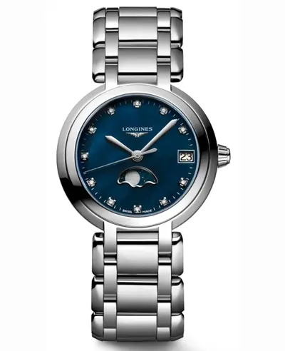 L81154986 Longines women's quartz watch with Blue Mother-of-Pearl dial, featuring Silver tone hands and Diamond-like hour markers. Includes Moon-phase sub-dial function. Powered by the Swiss-made Longines Caliber L296 movement. Features Hour, Minute, Second, Date, and Moon phase functions. Equipped with a 30.5mm stainless steel case, scratch-resistant sapphire crystal glass, round shape, solid back cover, and is water resistant up to 100 feet (30 meters). Comes with deployment clasp with push button folding mechanism.