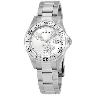 Stainless steel case with a stainless steel bracelet. Uni-directional rotating stainless steel bezel with a silver-tone top ring. Silver (decorative flowers crystal-set) dial with luminous silver-tone hands and index hour markers. Minute markers around the outer rim. Dial Type: Analog. Luminescent hands. Date display at the 3 o'clock position. Hattori caliber PC32A quartz movement. Scratch resistant mineral crystal. Pull / push crown. Solid case back. Case size: 38 mm. Case thickness: 12 mm. Round case shape. Band width: 18 mm. Band length: 7 inches. Fold over with safety release clasp. Water resistant at 100 meters / 330 feet. Functions: date, hour, minute, second. Additional Info: suitable for snorkeling, as well as swimming, but not diving. Casual watch style. Invicta Angel Silver Dial Ladies Watch 12506.