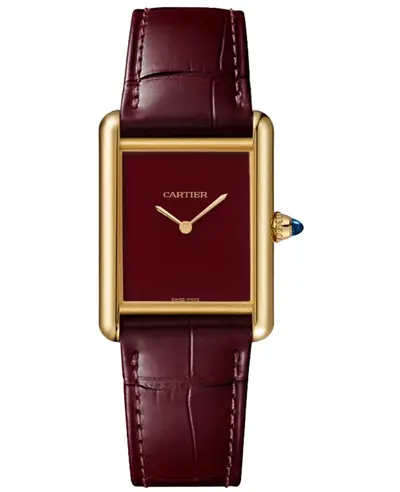 Authentic brand new Cartier Tank Louis Cartier large watch with manual winding movement, a burgundy lacquered dial accented by polished yellow gold tone hands, an 18K yellow gold case and bracelet strap finished with brushed/polished surfaces. Features include an 18K yellow gold tang clasp, fixed bezel, sapphire crystal glass, push-pull crown set with a cabochon finish, rectangle case shape measuring approximately 33.7mm x 25.5mm with a thickness of 6.6mm, solid case back, water resistance up to 30 meters (100 feet), and is powered by the Swiss Manual Winding 1917 MC movement offering 38 hours power reserve. Comes with a 2 year WatchMaxx warranty.