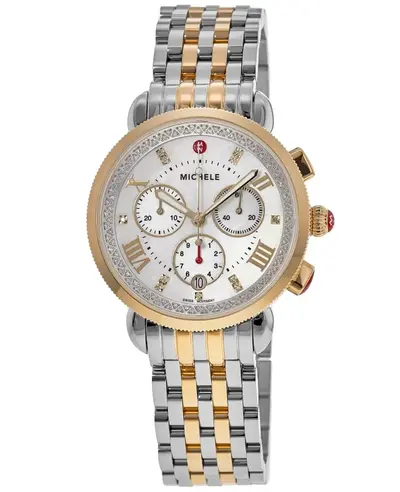 Authentic women's watch from Michele. Model: MWW01C000142. Features a stainless steel case with silver-tone and gold-tone accents, deployment clasp with push button mechanism, mother of pearl dial face featuring gold tone hands and Roman numeral hour markers with minute markers around the inner rim, date function at 6 o'clock position, battery operated quartz movement, three sub-dials for chronograph functions including tenths of a second, seconds, and minutes display. Includes scratch-resistant sapphire crystal lens, round case shape measuring 38mm in size, solid back cover, water resistant up to 50 meters or approximately 165 feet, equipped with date, hour, minute, second hands, and chronograph features.