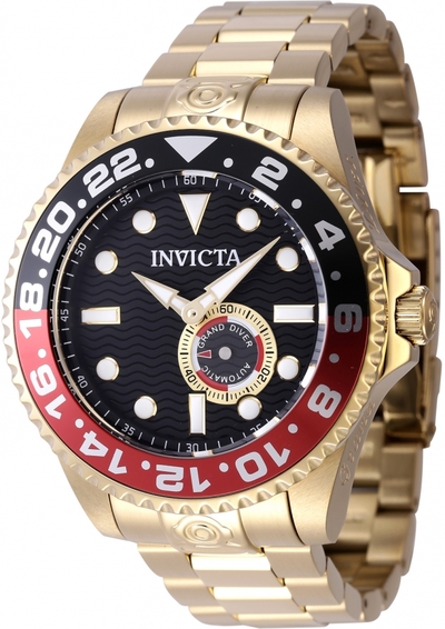 A men's dive watch featuring a black dial and gold-tone accents. Gold-tone stainless steel case with unidirectional rotating bezel incorporating red and black ceramic inserts (Coke). Analog display shows hours, minutes, and small seconds on an inner subdial; minute markers are present around the outer ring alongside luminous hour markers and hands for enhanced nighttime readability. Equipped with a Miyota Caliber 8245-21A automatic movement containing 21 jewels, beating at 21600 vph (approximately 28,800 bph), boasting an approximately 40-hour power reserve. The case measures 47 mm in diameter and is 17 mm thick. Secured by a screw-down crown and features a mineral crystal face with scratch resistance properties along with luminescent elements for the hands and markers. Includes a transparent sapphire or mineral case back allowing visibility of the movement, and round-shaped models are standard. The bracelet is crafted from gold-tone stainless steel measuring 22 mm in width. It includes a fold-over safety clasp mechanism. Water resistant up to 300 meters / 1000 feet depth suitable for diving activities.