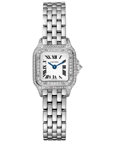 Brand New Authentic Cartier luxury watch model WJPN0046. Features an octagonal polished Rhodiumized 18K white gold case, a solid fixed white gold bracelet band with folding clasp, blue scratch-resistant sapphire crystal lens, silver dial with rhodiumized/polished hour markers and Roman numeral indicators, polished blue hour/minute hand set, Swiss quartz movement providing accurate timekeeping, diamond set bezel or crown accent, 30M water resistance rating (equivalent to approximately 100 feet), powered by push-pull mechanism functions.