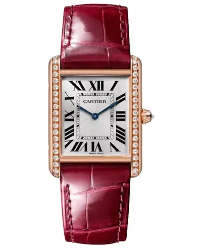 Brand new authentic women's luxury watch. Model: WJTA0038, features manual winding mechanical movement. Constructed from rectangle case shape in 18K rose gold. Features a silver dial with polished blue hands and Roman numeral hour markers along with minute markers on the inner rim. Equipped with a fixed bezel and tang clasp made of 18K rose gold. Includes a brilliant-cut diamond set crown totaling 0.66 carats. Secured by solid case back over mineral crystal glass. Claret alligator leather strap included for women's wrist size adjustment. Water resistant to 30 meters (approximately 100 feet). Comes with a 2 year WatchMaxx warranty.