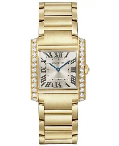 18K Yellow Gold case, 18K Yellow Gold bracelet, Diamond set bezel, Push-Pull crown, Polished Roman numeral dial face with minute markers on inner rim, Polished Blue Hands, Sapphire crystal, Rectangle shape measuring 32mm x 27mm and 7.1mm thick, Solid back, 30 meters water resistant (approx. 100 feet), WatchMaxx warranty for two years.