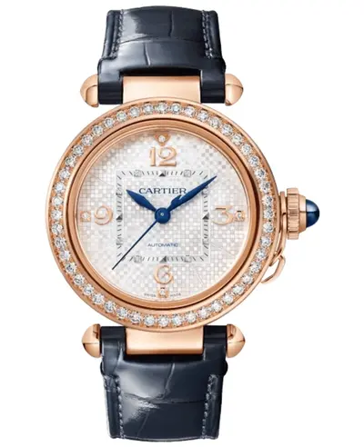 A women's luxury automatic watch from Cartier featuring a silver dial, an 18K rose gold case with diamond-set bezel and blue alligator leather strap. The polished 18K rose gold deployment clasp ensures secure fastening. Equipped with a Swiss automatic movement based on the Cartier 1847 MC calibre (approx. 3-day power reserve). Water resistant up to 100 meters / 330 feet. Includes beige calfskin strap as an additional accessory. Features include hour, minute, second indication and power reserve display.