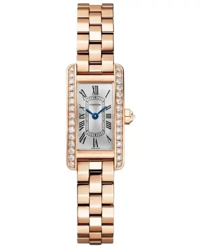 Cartier Tank Mini Quartz Luxury Watch. Silver Dial with Polished Blue Hands and Roman Numeral Hour Markers including Minute Markers on an Inner Rim. Features Diamond Set 18K Rose Gold Case, Brushed and Polished Finish, Solid Case Back. Includes Polished 18K Rose Gold Bracelet Band equipped with a Folding Clasp. Powered by Swiss Quartz Movement. Protected by Scratch Resistant Sapphire Crystal. Rectangle Case measures approx 28mm x 15.2mm in size with thickness of 6.5mm.