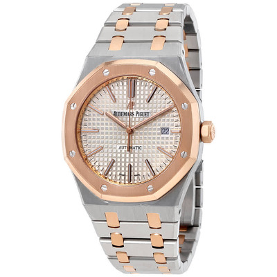 Analog quartz watch with automatic movement Calibre 3120, containing 40 jewels and comprising 280 parts operating at 21600 vph frequency, featuring a power reserve of approximately 60 hours. Silver dial accented by rose gold-tone hands, luminous markers, and index hour indicators. Minute markers present on the outer bezel ring. Two-tone stainless steel case paired with an octagon-shaped 18kt rose gold bezel secured by 8 screws, along with a two-tone (silver-tone and rose gold-tone) stainless steel bracelet fixed via 8 screws. Scratch-resistant sapphire crystal lens. Screw-down pusher crown for chronograph functions if applicable. Transparent sapphire case back displaying the movement. Date window positioned at the 3 o'clock mark. Fold-over clasp mechanism equipped with a safety release function if present. Water resistant to 50 meters / 165 feet depth, suitable for swimming and splashing but not diving.