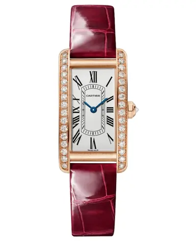 Authentic Cartier Tank Small Quartz Watch Model WJTA0042. Silver Dial with polished blue hands, Roman numeral hour markers, and minute markers around the inner rim. Features 33 brilliant-cut diamonds totaling 0.96 carats set on an 18K Rose Gold case that has both brushed and polished finish. Equipped with a Red Alligator Leather Strap secured by an 18K Rose Gold Tang clasp. Movement is Swiss Quartz, providing precise timekeeping functions for hours and minutes. Protected by Scratch Resistant Sapphire crystal lens. Rectangle case shape measuring 35.4mm x 19.4mm in width and thickness of 6.8mm. Includes a solid case back and comes with 2 year WatchMaxx warranty. Water resistant up to 30 Meters (approx. 100 Feet).