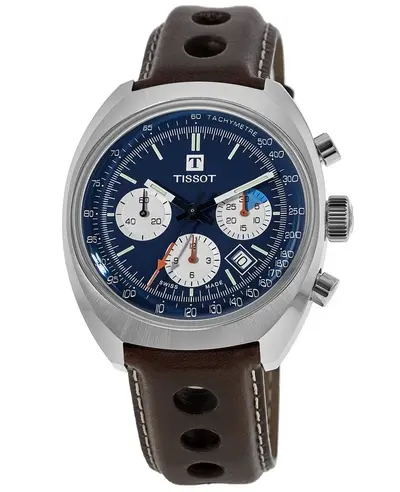 Brand New Authentic Men's Tissot Heritage 1973 Sports Watch Model T124.427.16.041.00. Silver dial with black hands, index hour markers and outer minute track. Three sub-dials displaying seconds, minutes (up to 30 minutes), and hours for the chronograph function. Automatic mechanical movement housing a Valjoux A05.H31 caliber motor with 60-hour power reserve. Includes date display at the 4 o'clock position. Tonneau case shape measuring 46.6mm in width, 43mm in height, and 14.8mm thick. Scratch-resistant sapphire crystal lens. Deployment buckle with push button clasp closure. Leather strap secured by stainless steel casing. Water resistant to 100 meters or 330 feet.
