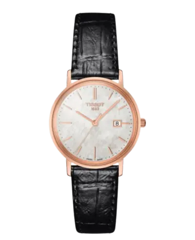 An authentic women's wristwatch from Tissot featuring a sophisticated design. 18kt rose gold case, mother-of-pearl dial, black leather strap, quartz movement with Caliber ETA E61.111 engine, date function, hour minute second hands, rose gold tone indices and outer minute markers on the dial, scratch resistant sapphire crystal lens, round case shape measuring 29mm in diameter and 4.9mm thick, water resistance up to 30 meters (100 feet), secured by a tang clasp.