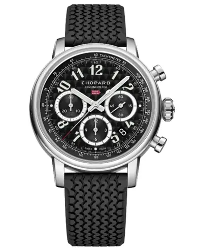 A brand new authentic Chopard sports watch model 168619-3001. It features an automatic movement and a black dial with luminous silver tone hands, arabic numeral hour markers including minute markers around the outer rim, three sub-dials displaying small seconds, 30 minutes, and 12 hours, plus date display between 4 and 5 o'clock. The case is polished Lucent stainless steel with a tire profile design. It comes equipped with a rubber strap featuring a polished stainless steel tang clasp and scratch resistant sapphire crystal glass for the transparent black dial. Water resistance up to 50 meters (165 feet). Includes a 2 year WatchMaxx warranty.