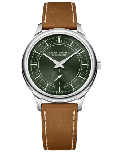 Authentic Chopard luxury men's watch model 168629-3001. Polished lucent stainless steel case with polished lucent stainless steel strap and brown leather material. Polished stainless steel tang clasp. Smooth bezel. Dial features a forest green background, polished silver tone stick hour markers including minute markers around the outer rim, and second sub-dial display. Equipped with push-pull crown, scratch resistant sapphire crystal glass, round case shape measuring 40mm in diameter and 7.20mm thick. Powered by Chopard L.U.C 96.12-L automatic movement offering a power reserve of approximately 65 hours (or more precisely, up to three days). Water resistant to 30 meters / 100 feet. Transparent case back. Comes with WatchMaxx warranty and is guaranteed for two years.