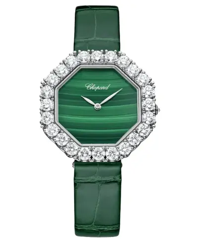 A brand new authentic Chopard women's luxury watch. Features an octagonal 18K white gold case, polished finish. The green dial has white gold tone applied hour markers and polished hands. Includes a diamond-set bezel with fixed setting. Equipped with a scratch-resistant sapphire crystal lens. Comes on a genuine green alligator leather strap fitted with a diamond-set 18K white gold tang buckle strap closure. Powered by the Swiss automatic CHOPARD 09.01-C engine, offering approximately 42 hours power reserve. Water resistant up to 30 meters (approx. 100 feet). Solid case back and includes WatchMaxx warranty for two years.