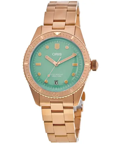 A women's bronze diver watch from Oris featuring a green dial. It has bronze bracelet with push-button clasp, unidirectional rotating bezel, bronze hands and dot/index hour markers, minute markers on the outer rim, automatic movement powered by Oris Caliber 733 mechanical movement (38 hours power reserve), date function at the 3 o'clock position, sapphire crystal resistant to scratches, round case shape measuring 38mm in diameter, solid case back, and is water-resistant up to 100 meters / 330 feet. Includes a 2-year WatchMaxx warranty.