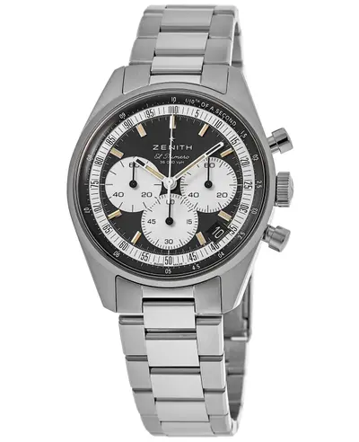 Brand: ZENITH (Swiss Luxury Watch). Model Name: Chronomaster Original. Dial Color: Black. Case Material: Stainless Steel. Case Size: 38mm Round. Movement Type: Automatic mechanical, Caliber El Primero 3600. Functions: Date display at the 4-5 position, Analog sub-dials displaying seconds and tenths of a second (1/10th), analog minutes sub-dial for chronograph timing. Additional Features: Three sub-dials on black dial; Silver tone hands with index hour markers; Minute markers around outer rim; Scratch-resistant sapphire crystal; Water Resistance: 50 meters / 165 feet.