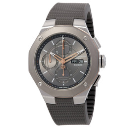 A men's automatic chronograph watch from Baume et Mercier's Riviera series. Features a round grey dial with index hour markers, minute markers around the outer rim, and three sub-dials displaying 60-second, 30-minute, and 12-hour functions. Equipped with an analog movement showing hours, minutes, seconds, and days of the month. Comes in a silver-tone stainless steel case paired with a grey rubber strap featuring a fixed matching bezel. Item Variations: MOA10722, 10722.