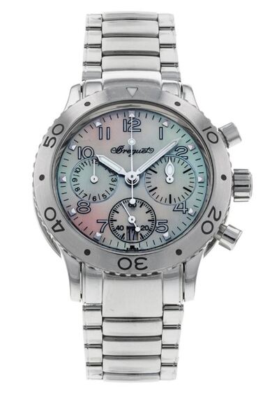 Stainless steel case with stainless steel bracelet, Uni-directional bezel, Mother of pearl dial featuring luminous hands and Arabic hour markers, Minute markers around the outer rim, Analog dial type, Date display at the 6 o'clock position, Chronograph equipped with three sub-dials for seconds, minutes and hours respectively, Caliber 550 automatic movement including approximately 48 hours power reserve, Scratch resistant sapphire crystal glass, Screw down crown, Case size is 33.5 mm, Case thickness is 11.8 mm, Round case shape design with hidden folding clasp, Water resistant up to 100 meters / 330 feet depth, Functions include chronograph, date, hour and minute display.
