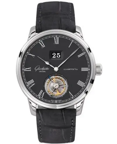 Men's watch with an elegant grey dial and grey alligator leather strap. Features an 18K white gold case, automatic Glashütte Original Caliber 94-03 movement including a tourbillon carriage small second function, date display at the 12 o'clock position, sapphire crystal glass for scratch resistance, round shape measuring 42mm in diameter and 13.7mm thick, transparent case back, and water resistance up to 50 meters (165 feet).