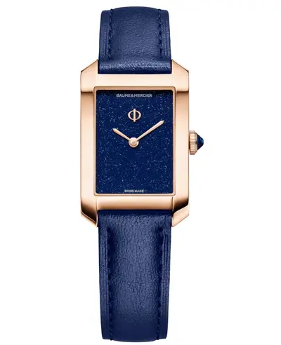 Brand New authentic Baume & Mercier Hampton women's watch with blue dial and leather strap. Features an 18kt rose gold and titanium case, pink hue sparkling blue dial, rose gold-tone hands, fixed bezel, quartz movement powered by battery, hour and minute functions, rectangular case shape measuring 34.9mm x 22.2mm thickness at 6.92mm, solid case back, water resistance up to 50 meters (165 feet), and comes with a 2-year WatchMaxx warranty.