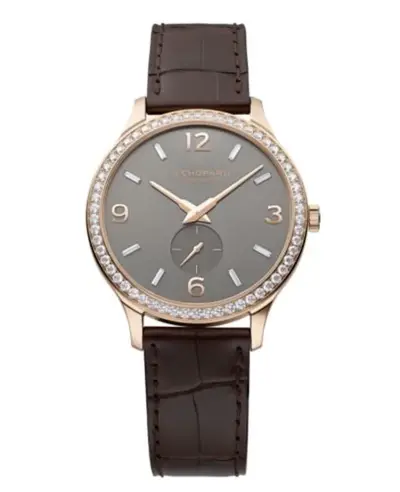 A luxury women's watch from Chopard featuring an elegant gray dial with rose gold-tone hands and Arabic numeral markers, a chronometer movement, small seconds sub-dial for timing functions, date display at the 3 o'clock position, fixed bezel set with diamonds, 40mm round case in 18kt Rose Gold with brown leather strap equipped with tang clasp. Resists up to 30 meters of water depth (approx. 100 feet). Equipped with a scratch-resistant sapphire crystal glass and comes with a 2-year WatchMaxx warranty.