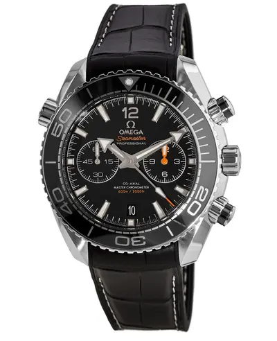 Authentic Omega Seamaster Planet Ocean 600M Chronograph. 45.5mm stainless steel case with black rubber-lined alligator leather strap and folding clasp. Features luminous silver tone hands, index hour markers (with minute markers), date display at the 6 o'clock position, chronograph functions with sub-dials for seconds, hours, power reserve, and minutes indicators around outer rim. Equipped with scratch-resistant sapphire crystal glass, screw-down crown, automatic - Chronometer movement powered by Omega Calibre 9900 engine (luminous silver tone hands, index hour markers). Includes uni-directional rotating bezel and transparent case back. Water resistant up to 600 meters / 2000 feet.