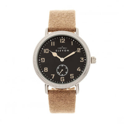 Silver-tone alloy case, tan genuine leather strap. Fixed silver-tone alloy bezel on black dial featuring Arabic numeral hour and minute markers around the outer rim. Luminescent hands indicating hours and minutes; small second function displayed prominently alongside a subdial. Powered by reliable quartz movement manufactured in Japan. Equipped with scratch-resistant mineral crystal lens. Water resistant to 50 meters / 165 feet (5 ATM). Pull/push crown, solid case back. Round shaped case measuring 42 mm diameter and 11 mm thick; band width of 20 mm. Secured by buckle clasp. Casual watch style.