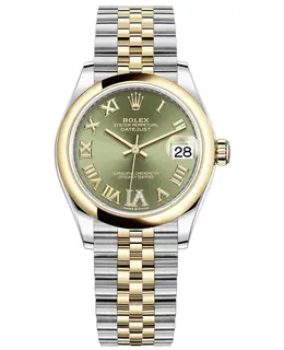 New authentic Rolex Day-Date watch. 18kt yellow gold polished case, fixed-fluted bezel, polished yellow gold bracelet with crownclasp clasp. Features a mother-of-pearl dial embellished with diamond hour markers and luminous Rolex hands displaying the day and date functions. Powered by an automatic movement (Rolex Calibre 3255) offering approximately 70 hours of power reserve. Includes screw-in winding crown, sapphire crystal with scratch resistance properties, round case measuring 36mm in diameter. The watch is solid-backed and features water resistance up to 100 meters (approximately 330 feet). Secured by a 5-year WatchMaxx warranty.
