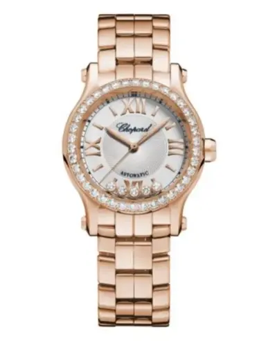 A new authentic Chopard Happy Sport watch with a silver dial and steel bracelet. Features a rose gold case, automatic self-winding mechanical movement, folding clasp closure, fixed bezel set with diamonds, scratch-resistant sapphire crystal glass, round shape measuring 30mm in diameter and 11.23mm thick. Includes luminous hour markers (rose gold tone) Roman numeral/index hour markers with minute markers around the outer rim and 5 floating diamonds on a silver dial. Comes with water resistance up to 30 meters / 100 feet and a 2 year WatchMaxx warranty.