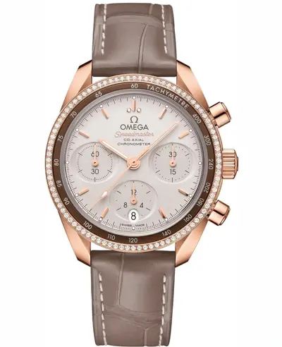 An authentic Omega Speedmaster chronograph with co-axial chronometer movement. Features a silver dial and case set in rose gold-tone, powered by Calibre 3330 automatic engine offering 52 hours power reserve. Includes diamond-set bezel decoration and date functionality at the 6 o'clock position displaying on sub-dials alongside hour/minute/second indicators. Deployment fold-over clasp closure included along with a genuine leather strap connecting to the solid rose gold-tone case back (18K Rose Gold). Water resistant up to 100 meters / 330 feet depth for swimming activities but not diving. Comes complete and includes standard Omega Calibre 3330 specifications.
