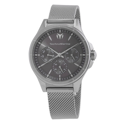 Silver-tone stainless steel case with mesh bracelet, fixed bezel. Charcoal dial features silver-tone hands and index hour markers including minute markers around the outer rim; analog display type shows date at 3 o'clock position alongside three sub-dials displaying day and 24-hour functions. Equipped with a VH63 quartz movement, scratch resistant mineral crystal lens. Features a pull/push crown and solid case back. Round shape measures 36 mm in diameter and 10 mm thick; band width is 16 mm and length approximately 7.75 inches secured by fold over clasp. Water resistant up to 100 feet (approx. 30 meters). Includes second time zone function, hour minute second displays. Part of the Moonsun Series from Japan Movt., intended for casual wear.