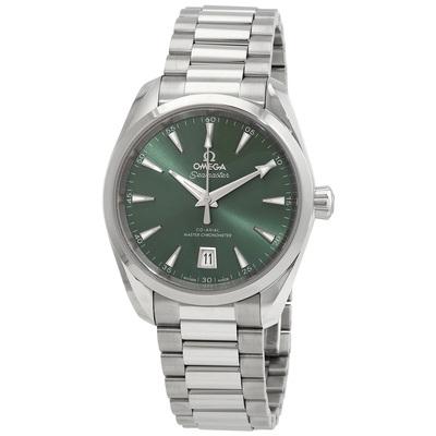 Silver-tone stainless steel case and bracelet. Fixed silver-tone stainless steel bezel. Green dial with rhodium-plated hands and index hour markers. Arabic numeral minute markers (at 5 minute intervals). Dial Type: Analog. Luminescent hands and markers. Date display at the 6 o'clock position. Omega Calibre 8800 Automatic movement, containing 35 Jewels, bitting at 25200 vph, and has a power reserve of approximately 55 hours. Scratch resistant sapphire crystal. Round case shape, case size: 38 mm. Band width: 19 mm, band length: 7 3/4 inches. Water resistant at 150 meters / 500 feet. Functions: date, hour, minute, second, co-axial escapement, chronometer, magnetic resistant. Seamaster Aqua Terra Series. Luxury watch style. Watch label: Swiss Made. Pre-owned Omega Seamaster Aqua Terra Automatic Chronometer Green Dial Unisex Watch 220.10.38.20.10.002.