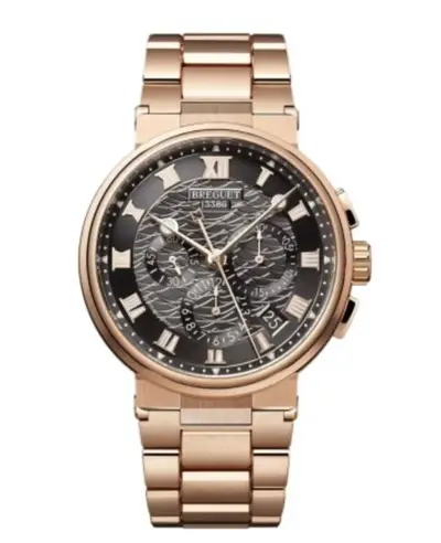 Authentic Breguet Marine Chronograph Model 5527br/g3/rw0. Features a grey dial with luminous tipped hands and Roman numeral hour markers featuring luminous minute markers around the outer rim. Includes date display between 4-5 o'clock, alongside three sub-dials indicating small seconds, 30 minutes, and 12 hours. Equipped with an automatic movement offering a 48-hour power reserve. Rose gold case with both brushed and polished finish, matched rose gold bracelet band and deployment clasp. Secured by a screw-down crown. Protected by sapphire crystal that is scratch resistant. Round shape measuring 42.3mm in diameter and 13.85mm thick. Water resistant to 100 meters (approximately 330 feet). Comes with a 2-year WatchMaxx warranty.