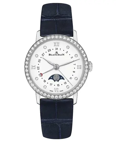 Around polished stainless steel case, blue alligator leather strap with tang clasp. White dial featuring partial diamond and silver-tone hour markers, scratch-resistant sapphire crystal. Automatic self-winding movement with approximately 40 hours power reserve. Includes moon phase complication functions. Transparent sapphire caseback. Water resistant to 30 meters (100 feet). Comes with a 2 year WatchMaxx warranty.