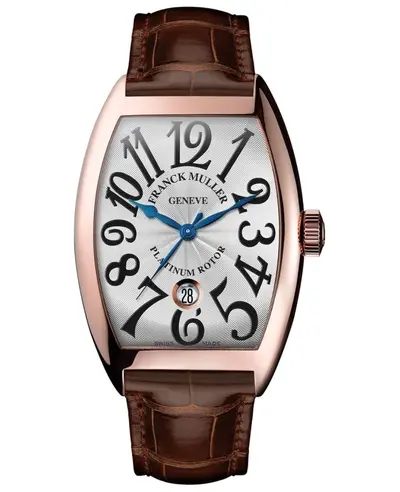 Authentic Franck Muller Cintree Curvex model 7880 sc dt 5n. New in box. White dial with blue hands and Arabic numeral hour markers. Automatic mechanical movement. Includes date function. Protected by scratch-resistant sapphire crystal. Features a tonneau shaped case measuring 50mm x 36mm. Comes with an authentic brown leather strap. Backed by a WatchMaxx two-year warranty.