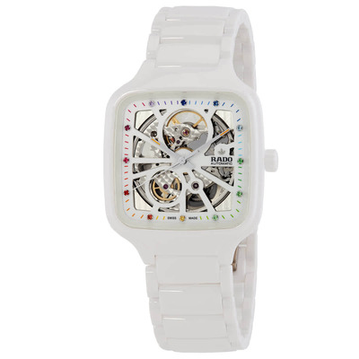White high-tech ceramic case and bracelet. Fixed white high-tech ceramic bezel. White dial with silver-tone hands and crystal hour markers. Minute markers around the outer rim. Dial Type: Analog. Rado Calibre R734 automatic movement with an 80-hour power reserve. Scratch resistant sapphire crystal. Transparent case back. Square case shape, case size: 38 mm, case thickness: 9.7 mm. Deployment with push button release clasp. Water resistant at 50 meters / 165 feet. Functions: hour, minute, second. True Square Series. Luxury watch style. Watch label: Swiss Made. Rado True Square Open Heart Automatic White Dial Unisex Watch R27073712.