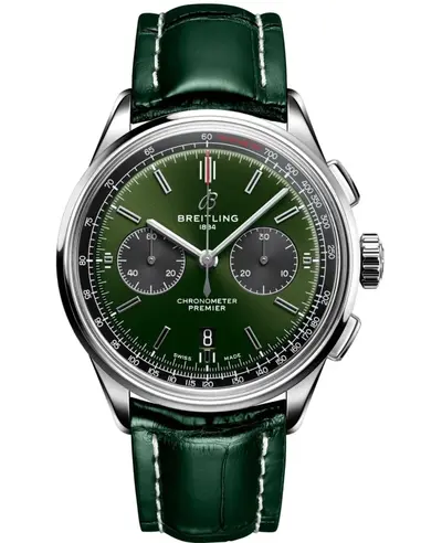 Authentic Breitling Premier B01 Chronograph. Features stainless steel case and green alligator leather strap with tang clasp. Equipped with fixed bezel, automatic chronograph movement (Breitling Caliber 01), date function at the six o'clock position, sapphire crystal with scratch resistance, round case measuring 42mm in diameter and 13.6mm thick. Includes a power reserve indicator, hour, minute, second hands, three sub-dials displaying chronograph minutes (up to 30) and seconds (up to 60). The green dial features silver-tone luminous hands and index hour markers with minute markers. Water resistant up to 100 meters or approximately 330 feet. Comes complete with a standard 5-year WatchMaxx warranty.