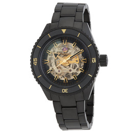 High-tech ceramic black and titanium case and bracelet, unidirectional rotating black high-tech ceramic and titanium bezel, skeleton dial with silver-tone hands and index hour markers, minute markers around outer rim, analog dial, Rado Calibre R808 automatic movement with 80-hour power reserve, scratch resistant sapphire crystal, screw down crown, solid case back, round 43mm case size, 14.6mm thickness, deployment clasp with push button, water resistant to 300 meters, hour minute second functions, limited edition 1962 pieces, Captain Cook Series, Swiss Made luxury style, item reference R32147162