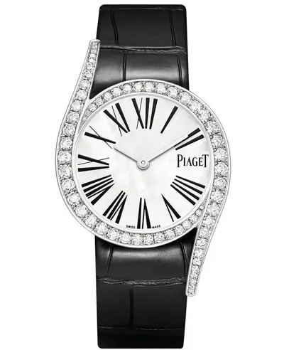 Authentic Piaget women's watch model G0A43390. White gold case set with diamonds and featuring a mother-of-pearl dial accented by Roman numeral hour markers, silver tone hands, and black alligator leather strap with tang clasp. Powered by the Piaget 430P automatic movement (43 hours power reserve). Includes sapphire crystal glass resistant to scratches and is water-resistant up to 30 meters/100 feet.