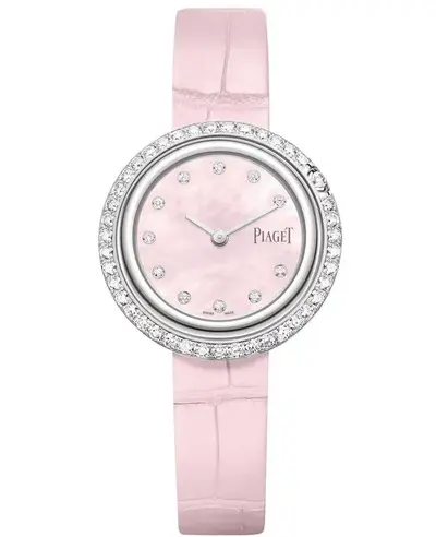 Authentic new Piaget Possession watch with mother-of-pearl dial and diamond hour markers. White gold case, pink alligator leather strap with tang clasp. Quartz movement powered by Piaget 56P engine. Functions include hours and minutes. Features sapphire crystal resistant to scratches. Round case shape measuring 29mm diameter and 7.47mm thickness. Water resistant up to 30 meters (100 feet). Includes a two-year WatchMaxx warranty.