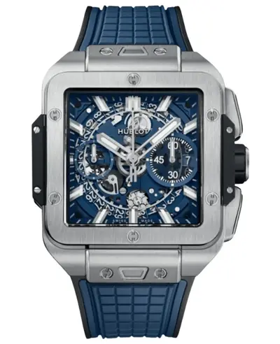 Key features: Blue Skeleton Dial, Luminous Silver Tone Hands, Stick Hour Markers with Minute Markers on Outer Rim, Date Displayed at Three o'clock Position, Titanium Cushion Case Shape, Automatic Flyback Chronograph Movement, Hublot Caliber HUB1280 UNICO Engine, Swiss Made Movement, Powered by 72-hour Power Reserve Indicator (Date), Sub-dials for Seconds Function and Minutes Counter (60-minute), Date Display on Transparent Case Back or via the three o'clock display? Wait no: The date is displayed at three o'clock via a separate sub-dial window. Let's correct this.