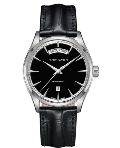 A brand new authentic Hamilton Jazzmaster day date auto men's watch model h42565731. The stainless steel case is paired with a black alligator leather strap and equipped with a tang clasp, fixed bezel, black dial, automatic day date movement via push-in crown, scratch-resistant sapphire crystal, 42mm case size with transparent case back, rated at 50 meters or 165 feet water resistance, and comes with a 2 year WatchMaxx warranty.